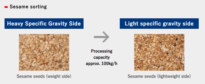 The raw materials supplied in a certain amount by the vibrating feeder are sorted by the wind blown up from the Sirocco fan built into the main unit, and the heavy specific gravity is discharged to the (1) port and the light specific gravity is discharged to the (2) port.